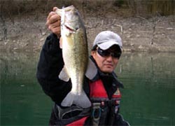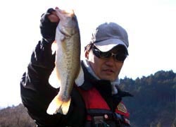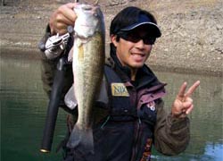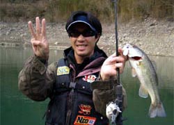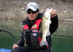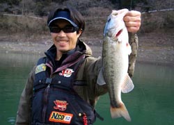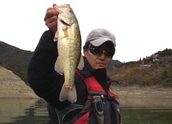 その後1時間、私はノーバイトでしたが、その間に横山プロが2匹連続キャッチされたので、私はカメラマン役。横山プロから、「この日のバスは浮き気味で、前日とはサイズも入れ替わっている」とのアドバイスをいただき、ジグのウェイトを1/2oz、から5/8ozに変更。