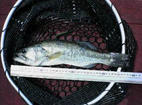 そのうちの1匹にノーシンカーをキャストすると即反応!信じられない!! バイトが甘く、アワセるとすっぽ抜けましたが、再度、キャストするとまたバイト!今度は慎重にフッキングできました。結構、強く引いたのですが、かなりヤセており、体長は39cmでしたが、ウェイトは約630gしかありませんでした。でも、とてもイージーにバイトしてきたことがとても驚きでした。