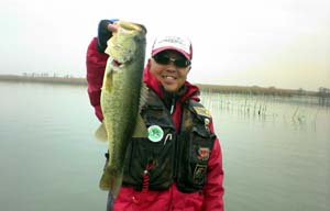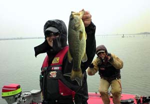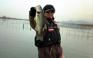 このことを頭の中でイメージしながら、乱杭際にキャストし、時間をかけてフォールさせ、ボトムに付いたところで軽く聞きアワセをすると、「クッ、クッ」という明確な生命反応を感じました。一投目からこのような反応があるとは予測していなかったため、一瞬ためらいながらも、即フッキングすると、バスの手応えが手許に伝わってきました。しかし、あまり強く引かないまますんなりボート際まで寄り、難なくネットランディングできました。サイズは37cm、約750g、低水温の中、このようなサイズでもワームにバイトしてきたことには、心底驚きました。この1匹から、ブレイクラインが近くにあるハードストラクチャーがこの日のパターンなのでは?と感じたものの、何かいまひとつ掴みきれなかったので、とにかく残りの乱杭を全て撃ちましたが、結果はノーバイトに終わりました。