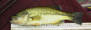 がっかりして添野川筋を下っていき、平井川筋とのインターセクション付近まで下ったところ、岸際におかしな動きをするバスを発見しました。私の目にはネストがあるようには見えませんでしたが、限られた狭い範囲内をウロウロしていたので、とりあえずルアーをキャストしてみると1投目から好反応を示しました。キャストがうまく決まらず、5投目でようやくバイトさせることができました。