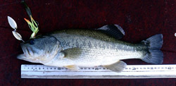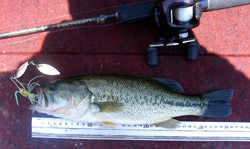 しかし後が続かなかったので、再度「平井川筋湯の花温泉古座川荘対岸のストレッチ」へ戻りSRミニをキャストするといきなり31cmがヒット!「これはイケル」と思い、夕方のワンチャンスにかけ再度バックウォーターへ。そこへ向かう途中のシャローフラットでスピナーベイトをキャストすると、なんとフォーリングでバイト、38.5cm約770gをキャッチ。しかし、バックウォーターのサイトでは、リーチのツネキチリグで、37.5cm約880gの1匹をキャッチするのが限界でした。