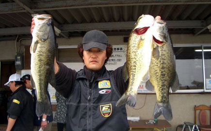そのような厳しい中、あくびをしているバスを発見!他の選手をブロックしながら狙い続けること約1時間、バスがシビレをきらし、イラついてエレキに向かって来た瞬間を見逃さず仕留め、約1,500gをキャッチ。次にその近くで、まるで鯉かと思うようなビッグなメスバスを見付けて追い回していると、イージーなオスに出会い、それを難なくキャッチして(約1,500g)リミット達成、時間は11時30分。