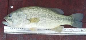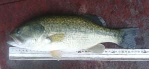 そして、期待を込めての第一投、バイトなし、二投、三投…バイトなし。「前日とはパターンが変わったか」と思った矢先、流れ込みに群れるベイトにボイルするバスを目撃、やっぱりこのスポットにはバスはいる!集中してキャストを繰り返すこと約30分、まず約500gをキャッチ、そして続けざまに約300gをキャッチ。ここで上流側の流れ込みに移動しようかと思った時、先程追い抜かした選手が、その流れ込みを狙いに行ったので断念。その選手が諦めて移動するまで、この流れ込みで粘ることにしました。