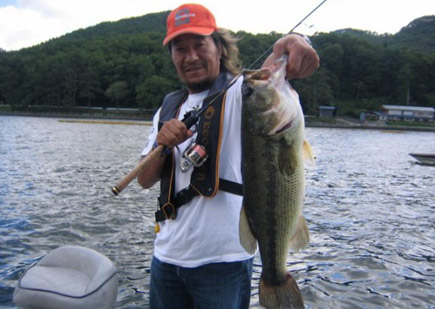 サイトもやらないので、見えバスも追いかけないですね。ですから地形で釣って行くタイプなんです。この日は40UPを好調に釣っていまして、ナイスなヤツがいるレンジにルアーが鋭く通って行く感触が明快でした。見えている感じ。プライベートで釣る時も、ガイド場として使っている場所を基準として、シーズナルなバスの動きを確かめてもいたんですね。ガイド場はセカンダリーの場所も多く、プリもアフターの回復も時によって混在する傾向があります。普段はあまり見えない大岩があって、行ってみると濁りがなくてシルエットがハッキリ見えたんですね。そこでエコギアのストレート5インチを投入、答えはすぐに返って来ました。今まで木崎湖では味わった事のない重量感のある引き!でも、木崎バスは異常に引くので40cm後半サイズかなと思っていたのですが、いやいや全然寄って来ないんですね。こちらは50cmを釣るぞ的な思いはないので、それにしてもおかしいんです。それもそのはず魚体を見てビックリ。デカ!!