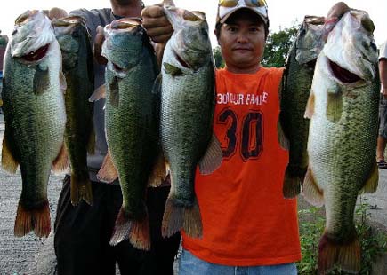 日々の移動中に気になっていたウィードエリアにダメモトで移動し、石川氏のカルプリットに55cmクラスがヒットするがジャンプバレ。その後ゲストと共に時には真剣に時にはゲラゲラと50cm前後を何本かキャッチしましたし、ゲスト2人は何本もかばらしてしまいました(写真のバス達位はバラシたのではないでしょうか?スゴイフック3/0を激伸ばしされましたし、ウィード化けも多かったですね)。
