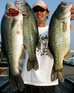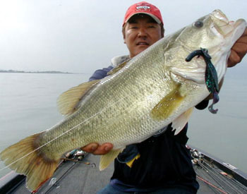 テキサスでは先週好調でしたウィードフラットエリアではBIG GAMEで1匹のみ。浚渫に移動し、石川氏の1投目にゲロ痩せの50cm弱がHIT。ランディングし私の1投目に小さなバイトでしたが強烈な引き、今年6本目のロクマルでした。ブラッシュホグのジュン・バクの8.8gテキサス・リグです。ラインはフロロの20lb、ロッドはレギュラーテーパの6.6クラスがお勧めです。長いのとファーストテーパのロッドはアワセ折れします。最近のジャパニーズ軽量ロッドではパワー不足です。チョット古い、重たいロッド、アメリカンロッドがお勧めです。