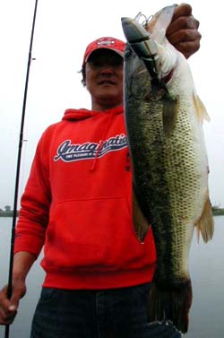 アサイチはやはりTOPエリアへ直行しました。私のオリジナルウッドベイト・TMブルーモツゴの1投目にいきなりデカバスのチェイス。しばらくしてゲストのペンシルにナイスなバイトがきましたがウィード化けしてしまいましたがその後に30クラスをキャッチ。