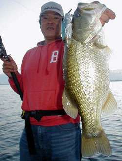 このデカバス手で引き上げました。アワセて巻こうとしてもハンドルが全く動きませんでした。リール内でギアに異常が発生したみたいです。タックルを持っていかにもこのタックルで釣った様に写っていますがこのリールこの時点で壊れています。その後もブルーシャッドで40UP追加で終了しました。写真はK氏のモンスタージャックjr. ブルーシャッドでの52cmです。