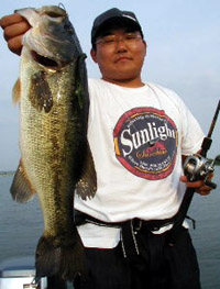 その後も無風が続きライトリグで色々なエリアを廻るも×。西岸2m前後ウィード内をミディアムクローのテキサスリグで探り55cm頭に40cm以上を7本キャッチしました。