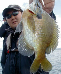 その後は野々垣氏がD-ZONEで私が見た中では最も大きい超でかギルをキャッチしたり釣れない時間が続きましたが、本日は50up(本日も? )をキャッチしていない石川氏に激震!!デカ物は14lbをぶった切っていきました。