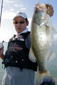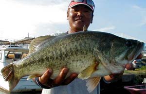 ゲスト斎藤氏は朝モンスタージャックjr.ブルーシャッドで44cmくらいのを幸先良くキャッチしたのですが。テキサスポイントへ行き、“こんな風にキャストして下さい”といった私のブラッシュホグ スイートポテトに写真のやたらおでこが反っているオスサーモン・ライクな56.5cmがヒットしてしまいました。ロクマルと思わせる引きでした。