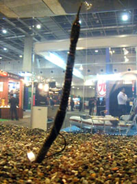 2月1日10時頃インテックス大阪に到着!! FISH ARROWブースでは既にジャーキー松本氏が水槽で私のプロデュースワーム“エアー クラッシュ6.6”をTVカメラの前で説明中。“THE HIT!!”のロケ中でした。