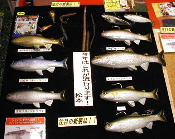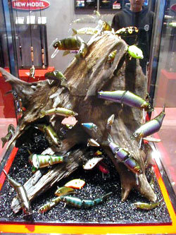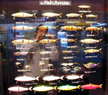 モンスタージャック、ITジャックなどビッグベイトの2008年ニューカラーのディスプレー。ニューカラーの“ゴールドギル”は私の提案したカラーです。