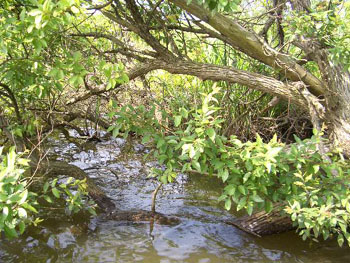 先行者が離れるのを見計らって手前にブッシュの入ったオーバーハングにテキサスリグを撃つ。オーバーハング内でバイトは無く、ルアーを回収しようとリーリング中に手前のブッシュから魚がダッシュ! ボラか? と思ったがなんとピックアップ寸前にもんどり打ってパワーホッグをひったくっていった!