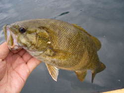 ポツポツ釣れ続くのです、がいずれも27〜29cmのノンキーパー。とくにスモールは小さくてもトンでもなくファイトするので上がってくるバスをみてガッカリするといったことが続きました。7〜8mのブレイクに移動し居付き型のスモールを狙ってみるとようやくキーパーサイズがヒット。かなり細身ながら貴重なキープサイズにホッ、しかしもう殆ど時間がありません。同じブレイクを何度もキャロイモで通すとグーッとロッドが持っていかれました。何度も突っ込まれながらもようやくキャッチできたのはこの日最大・600gクラスのスモールマウス・バス。
