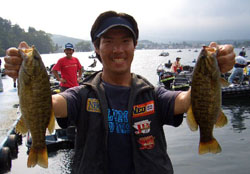 いうまでも無くスモールマウスの聖地です。今回はここで行われるマスターズ・決勝戦のレポートです。前週に入ったプリプラでは苦手のディープに落ちたスモールに手を焼きながらも野尻湖独自の方法のキャロライナリグを教わりなんとかポツポツとキャッチ、特に良かったのが大崎沖8mと砂間ヶ崎沖の水中島8m。大崎沖のスモールはワカサギの群れを追っかけているフラット・回遊型のバス。一方、水中島のバスはブレイク・居付き型のバスでフラットのバスよりサイズは良いものの単発、日によって釣れたり、釣れなかったりということがわかりました。