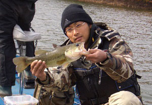 途中、ワンドの出口でチーム魚・社長(!?)の永田さんと松村さんのボートを発見。サイズは小さいながら1本釣れている様子。レンジを聞くと8m、やっぱり冷え込みのせいなのかかなり深めで釣れているみたいです。