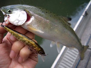 そんな訳でそれぞれのエリアの所要時間を調べたあと初日の夕方のワンチャンス、下流・水谷ワンド入り口から釣り開始。この時期にしては水温が低め(7度台)なのが気になったものの、まずはジャークベイトでチェック。するとなんと1投目からなにかがルアーにアタック!