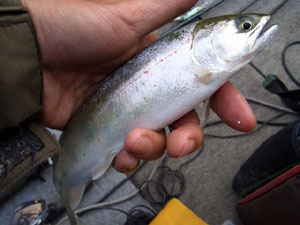 ピチピチーっと元気よく上がってきたのは小振りながら綺麗な銀毛アマゴ。よく周りを見回すとライズの波紋だらけ! このときだけはプラを忘れアマゴ釣りに没頭、ライズを見つけ波紋の向こうにミノーを投げ連続ジャークするだけでアッという間に5本のリミットメイク!? を達成してしまいました…。