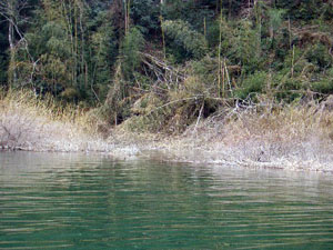 カバーフィッシング大好きな私にとって天国のような湖に思えたのですが…それにしても多過ぎ・濃過ぎです。日に日に水位が上がっていくにつれさらに冠水ブッシュは増大、さらにボートの引き波等で打ち寄せられた細かい流木がブッシュ内に入り込み、かなり重め(1/2oz以上)のシンカーにすり抜けの良いシェイプのコンパクトなワームを使わないとカバーを打ち抜くことすら困難です。そして、それを延々繰り返しても全くバスの反応はナッシング…まさに「カバー地獄」に入り込んでしまいました。
