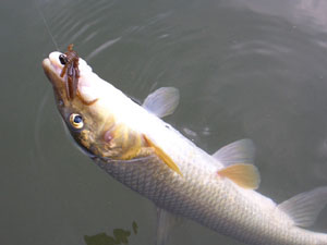 前日バイトを取っていたバスはどこかに行ってしまったのか、それとも反応する釣り方が変わったのか?張り出しのディープ側の選手が全く釣れてないのをみて後者と判断。さらにスローフォールで浮いているバスを狙うためにカットテール4インチのノーシンカーにチェンジし、やはり竹のレイダウンの際に落とすと1発でヒット。しかしキーパーサイズ25cmギリギリ。キープしたあとさらにこの釣りで流すがその後は全くのノーバイト。
