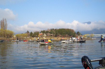 ほどなく会場・大池公園に到着。すでにこの大会に出場するほとんどの選手たちが集まっています。エンジンのみで浜辺に着岸してタックルチェック(ベストランの徳田さん、急いでおられる中どうもありがとうございます!)、受付に向かいます。周りはTOP50をはじめとする有名プロがいっぱい、自分がいるのが場違いな感じのする(?)ピリッとした雰囲気の中、今期初のビッグイベント・ジャパンスーパーバスクラシック2007が幕を開けました。