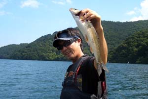 翌日9月8日、大会2日目です。完全に見失っている状態のまま、この日は前日唯一のキーパーを釣った琵琶島南岸の6mラインをまずはキャロライナリグで探ります。しばらくしてキーパーぎりぎり200gクラスながらファーストキーパーをキャッチ。しかし前日と同じくバイトは続かなく、菅川フラットに移動しますがここではノーバイト。もう1度琵琶島南岸に戻ると少し西寄りにポジションを取っていた相羽プロがロッドを曲げて格闘中、そしてビッグスモールをランディング! あぁ、やっぱりスゴイなぁー・・・というかうらやまし〜っ、とこちらも釣るために集中してダウンショットをステイさせますがやっとあったバイトで上がってきたのはまたぎりぎりのオンライン・キーパー。