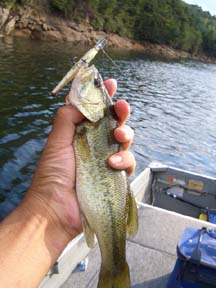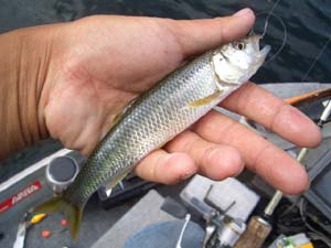 昼過ぎにボートを降ろしたためプリプラ初日は3時間半ほどの釣行。この弥栄ダムは船外機が使用禁止、エレクトリックモーターのみが動力となります。というわけでこの日は借りてきたハイパワーエレキ(小林明人くん、ありがとう! )のチェックも兼ねて本流・小瀬川筋を移動しながら釣り上ってみました。なんと1投目で弥栄初バスがジャークベイトにヒット!