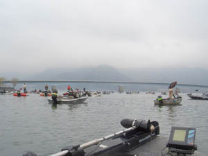 ジャパンスーパーバスクラシック2008、初日のスタートです。今回のプランは放流バスのみ狙い。足が速く、サイズの良いやつが放流地点からかなり流れて溜まっているのを狙うというもの。気合いを入れて臨んだのですが、朝の第1投で予想外のビッグネイティブ(推定2キロオーバー)が来たものの、焦ってしまい悔しいバラシ!