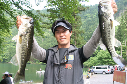 試合初日は予定どおり、朝一にバックウォーターサイトで800gクラスをキャッチ。10時以降は下流の立ち木を攻めリミットメイク後、700〜800gクラスを2本追加。5本で3キロオーバー、上出来の8位スタートです。