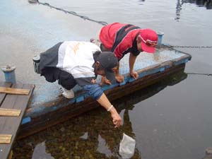 TOP50若手のホープ・篠塚亮くんと五十嵐誠くん。桟橋で一生懸命なにかを網ですくっています。