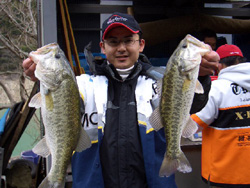 目の前で5本も釣られたわりにはウェイイン会場は賑わっていない。やはりあそこはハニースポットだったようだ。そこに地元・下北山村在住の山岡君が登場。どうやら2本のグッドサイズを持っているようだ。話を聞くと下流・平成の森エリアをメインにヒットルアーはなんとシャロークランク!!ウェイトは?と聞くと謙虚な山岡君は「1800g位です」と答えるが検量してみると2380g!! そのままそのウェイトを超える人は無く、優勝決定!!