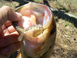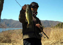 それらのバス達にもてあそばれながら時間は刻々と過ぎ、午後1時を廻ったときに溶岩の隙間の角に鼻の先だけ見えているバスを発見! すかさず自作エコワーム“Snipe Vacuum 1.5inchのショートダウンショットを送り込むと一発で喰った、が一瞬でスッポ抜け。