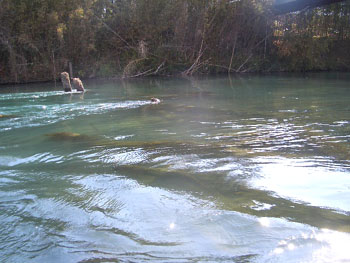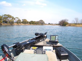 ともかくカートップのボートを降ろして、初の「キューヨシ」に出撃です。まずはフィールド全体を把握するためにエリア全域の景色を見て廻ります。エリア最上流はおもいっきり流れていて、もろに「川」という感じです。