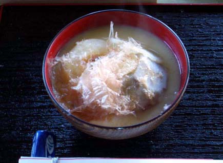 写真はお正月ということで私の実家の「京風お雑煮」、甘みのある白味噌仕立てで丸餅とオカシラ芋というイモが入っています。