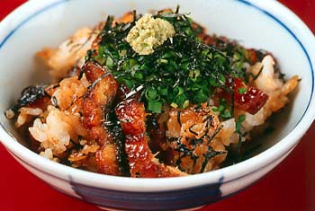 うなぎは輪切りか千切りにしてご飯の上に乗せてあります。で、このひつまぶしというのは食べ方に特徴があるんです。まず一杯目はうな重をおひつの中でかき混ぜて茶碗でいただきます。そして二杯目はきざんだネギとワサビなどで薬味をかけていただき、三杯目はお茶漬けにして食べます。以上が“ひつまぶし”の食べ方の概略です。