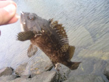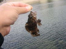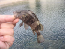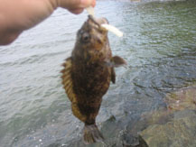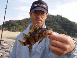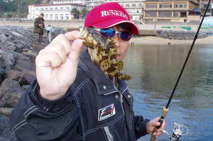 んで、穴釣りを始めていくと、釣れました!カサゴ!! それもなかなかのサイズ。いや〜なんか嬉しいですねぇ。初バスが釣れた気分です。穴の中にこまめに入れていったら“ググッ”って感じですね。ってまた「そんな事わかっとるわい!」と叱られそうですが・・・。このあとも数匹釣れましたができるだけ小さな穴のほうがよさそうです。それも少しでも水深があるほうがいいですね。