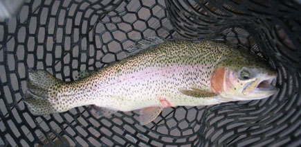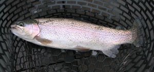 んで、実釣。今回は前回(といっても今年最初の話)良かったシルバーのスプーンからスタート。最初のうちはアタリがあってもノラなかったんですけど、しばらくしてググッと待望のアタリ。しかしやけに重い。慎重に取り込んだ魚は初の40アップのレインボーでした! ボトムぎりぎり(ていうか、ズルズル)でリトリーブ中のバイトでした。そのあとも30cm弱のレインボーをキャッチ。