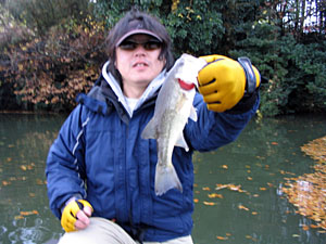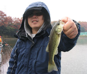 さて、しばらくして桟橋の先にいたくろますのところへhiroさんがやってきました。なにやら片手に何かを持っている。ん?魚?あ、バスじゃないの!! なんとhiroさん、シャローで釣っちゃったそうです。