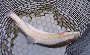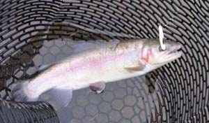 hiroさんと別れたあと、あれこれ用事を済まして下ノ池へ。午後1時すぎには到着して、結構人がいたので釣る場所に迷いましたが、とりあえず空いたところで始めることにしました。最初のうちはなかなか釣れなかったんですけど、徐々にバイトが取れるようになりレインボー君を3本ヒット。サイズは40cm弱ばかりでコンディションも良好。それにバイトもファイトも強烈なのが下ノ池の特徴。ホント楽しいですよ、ここ。