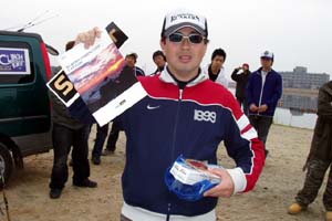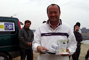 そして表彰式。まずは釣ったお二人へ賞品の授与を行い、それぞれ一言コメント。準優勝のよっしぃ〜☆さんは見合い橋周辺で10TEN-FEET UNDERプリティーシャッド(レッド)のダウンショットでキャッチ。ちなみにラインは事前に購入したリバージ18NLでした。とても柔らかいというのが率直な感想でした。昨年から引き運をガッチリつかんでいるよっしぃ〜☆さん。今年も大いに期待です。