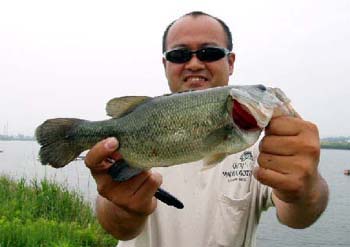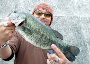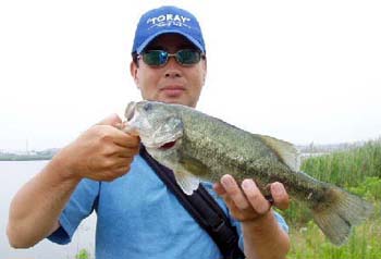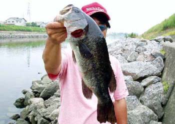 続いてそこから近いポイントでジルさんが38cmをカットテールのワッキーリグでキャッチ。ちなみにこの止水域は特にベイトが豊富で、しかも他のエリアよりも比較的大きいんです。通常は海と繋がる水門が開き、干満の影響で多少流れがあったほうが釣れやすいのですが、今回は天候も手伝ってか、それに影響されることなくバイトが連発したようです。ちなみにワッキー☆さん、他の場所でもバイトさせてたらしいですよ。なんか高いところでデカバスをバイトさせてしまったみたいで、取り込むまでに至らずだったみたいです。