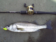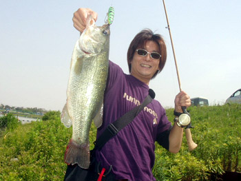そして、まずはその有名ポイントで結果は出ました。見合橋北岸で岡田クンがリトルマックス(ブラック)で48cmのビッグフィッシュをキャッチ!! このエリアは沖に向かっても水深が1m以下と浅いので着水してすぐにリーリングが基本です。岡田クンはルアーロストに苦しみながらも(3つくらいロストしたとかしないとか…)ついにキャッチ成功となった。