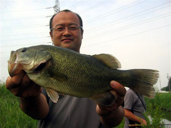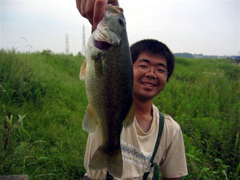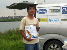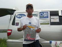 さあ、こうなると前大会に続いて、このままツブくんの2連勝か?と思われましたが、8時35分に前年度年間優勝のクリンチノット社長である石川さんから連絡が入りました。検寸係が向かうと38cm。ツブくんを3cm上回り逆転〜!石川さんは本湖を途中で見切り、朝鮮川に入ったところ、目の前でカエルを捕食するバスを見つけ、スティールハント4inのノーシンカーリグで見事キャッチしたとのことです。さすがですね!