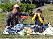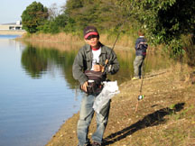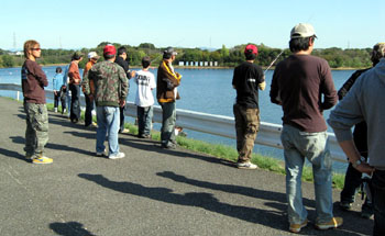 で、とみぞ〜さんに連れてきてもらったポイントは最終的に、今回クリンチ戦に参加した40数名が入ったどのポイントよりも良く、結果的には優勝(チビ君)、2位(とみぞ〜さん)、3位(KATSUU君)、5位(ワッキー☆さん)、そして8位(くろます)を占める最強ポイントでした。今大会では全体で9名がバスを釣っています。ちなみにくろますの場合、2本目に釣ったバスが釣り上げたあとにフックがハズレ、1mほどコロンコロン転がっていき、バスは検寸する前に池へサヨウナラ〜。せっかく連発でバイトがあったのにモノにすることができませんでした。なかなかうまくいきませんね。