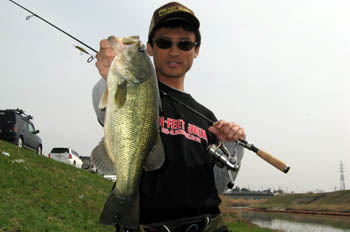 3月の大会で2本立て続けに釣れたことで、この日の天候が良い方向へ働いていることを実感。そして10時20分、祥君から2度目の連絡が入りました。祥君は朝鮮川の中流域で、サスペンドするバスをメガバスX-55でサスペンド気味で使用し、リアクションバイトに持ち込み、見事40cmをキャッチ。今大会はこの祥君の連絡を最後に終了となりました。
