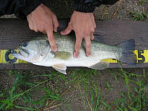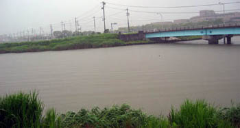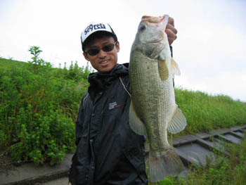 そしてついに見合橋の安城市側にある船だまり付近で、祥ちゃんが48センチをキャッチ!! ルアーはジャッカルのフリックシェイク(カラー:コーラ)で、1.3gのジグヘッドワッキー。濁ったコンディション特有の魚の動きを読み、ストラクチャー周辺を丹念に狙った結果でした。魚を掛けたポイントが複合ストラクチャーのため、ランディングに苦労したよですが、雨中で粘った甲斐あってのバイトだったため、ラインがストラクチャーに巻かれても冷静に対応したとのこと。