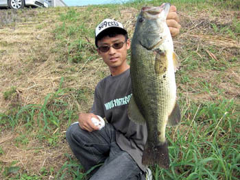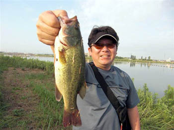 さあ、これでまた祥君の圧勝かと思われましたが、9時40分頃に黒鱒.comでもおなじみの水野君から連絡が入りました。サイズは32cm。ルアーは10FTUスキニーシャッド(ブルーギルカラー)です。水野君は朝イチに上流にある朝鮮川と半場川の合流点付近で、40アップのバスをミスバイトで逃してしまい、その後見合橋へ向かったが、本湖の反応は良くなかったため、もう一度合流点付近へ。そして近くにある橋のシェードで数匹のバスを発見。そのうちの一匹をしとめたそうです。おめでとうございます!そして、さらにその5分後にも29cmをキャッチ!! 水野君、一気に祥君を追い上げにかかります。