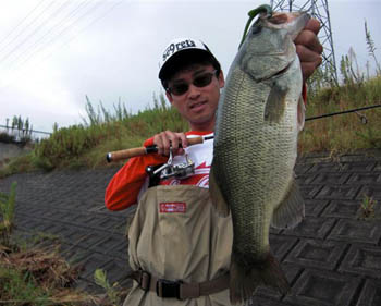 その後、雨は止み曇り空となりました。そして6:30、今年度3勝の祥君が高浜川の中流域にある水門付近で10FEET UNDERのスキニーシャッドのジグヘッドワッキーリグを使用して41cmをキャッチ。この時間帯、水門からは、本流よりもきれいな水が流れていたようで、ここがキモとなったようです。いやあ、さすがです。