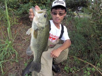 続いて8:20、祥君が稗田川の上流で、ケムケム0.9g+ジャッカルアイシャッドを使用し、本日2本目となる51cmをキャッチ。狙い目となったのは、1本目と同じく水門から本流よりもきれいな水が流れている場所で、そのそばにあるアシ際にバスがサスペンドしていたそうです。最初はバスなのかどうか分からず、半信半疑でルアーをポイントへ入れるとバイトしたとのこと。